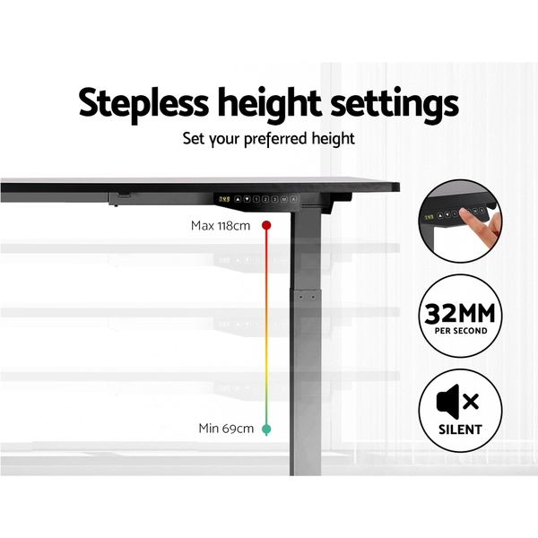 Nowadays, you need to work smarter in every way. And one way of doing that is to work with equipment that not only benefits your productivity but also your health. And that is where our Artiss Roskos Motorised Height Desk Frame can facilitate your working efficiency without any compromises. The innovative height adjustable desk frame actually has two built-in motors for superior performance and for a smoother and quieter height-adjustment operation. You can set up to three pre-set heights via the digital control panel or to any height of up to 118cm. Plus, the frame can also fit any desk top of between 120cm to 180cm in length and from 60cm to 80cm in width. Other great features include high quality powder-coated components, adjustable feet footings and a sit/stand reminder system. To sit or not to sit, that is the question that stands to be aptly answered with our Artiss Roskos Motorised Height Desk Frame.