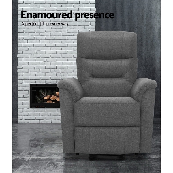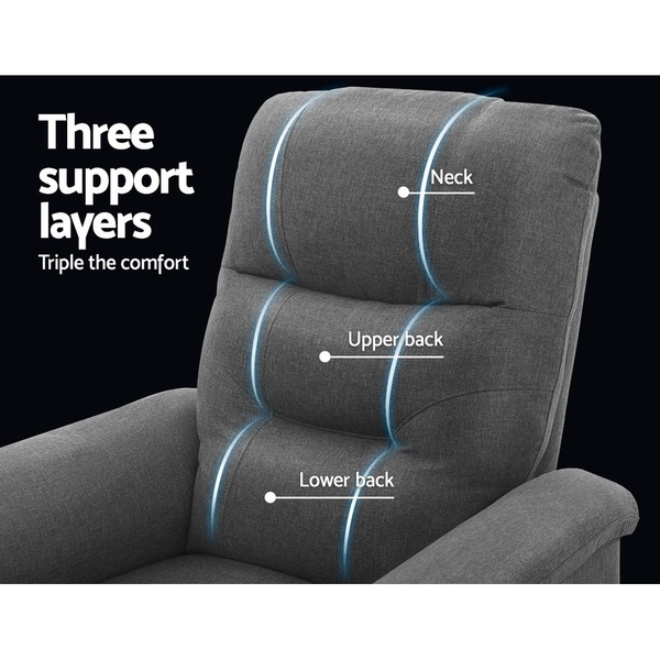 Stand up easily with our Artiss Recliner Chair. Richly padded in high-resilience foam and upholstered in smooth and luxurious faux linen fabric, the chair looks like it belongs in gold class. In the upright position, the recliner is a comfortable armchair where you can sit for long chats with guests. Or you can easily adjust the backrest and footrest to recline to your preferred angle. The backrest has three padded zones for full head and back support so that no matter the tilt, you have total body comfort. Most importantly, the recliner features a smooth lifting mechanism to assist you in getting up from your chair with minimum hassle, especially useful for the elderly with limited mobility. The chair is suitable in any room with its classic design. Keep it in your study to be perfectly rested during your work breaks. In the living room for watching television or listening to music. Or keep several in the media room for the complete cinema experience. Wherever you decide to put it, our recliner chair is there at your service in more ways than one.