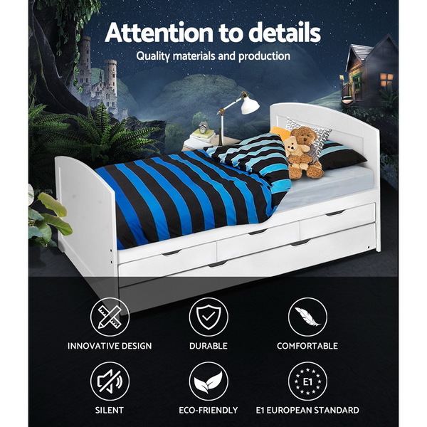 With its space-saving and massive storage features, our Artiss Duncan Trundle Bed is absolutely versatile and stylish in every way. It has three built-in drawers for storage, and a single-size trundle bed for guests. Crafted from solid pine wood and plywood slats, the bed is strong and stable with a balanced weight distribution across the framework. Plus, it also features smooth edges finishing and non-toxic paint for safe use with both adults and kids and has heavy-duty fixings to stand up to robust use and the test of time. Best of all, the bed frame suits any Australian single-sized mattress.