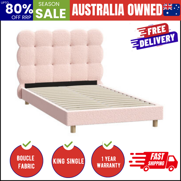 Bed Frame King Single Tufted Bedhead Boucle Fabric Pink