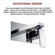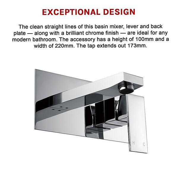 The clean straight lines of this basin mixer, lever and back plate along with a brilliant chrome finish are ideal for any modern bathroom. The accessory has a height of 100mm and a width of 220mm. The tap extends out 173mm.