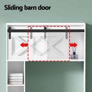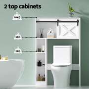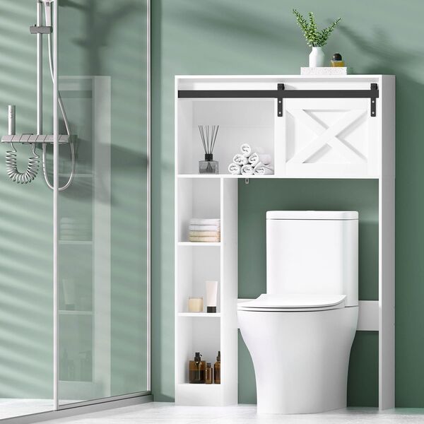 Keep your bathroom organised with an Bathroom Storage Cabinet. This neat and tidy storage solution is made from durable particleboard for long-lasting use. With three tiers of open shelving and two top cabinets with a sliding barn door, the unit gives you plenty of storage for your bathroom essentials. The entire piece sits neatly over standard toilets, or you can place it over your laundry basket or other storage for ultimate convenience. Easy to install and easy to clean, the Bathroom Storage Cabinet is just what your bathroom needs to stay tidy.