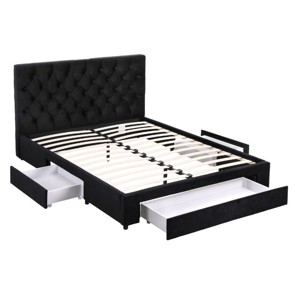 Elevate your bedroom with the DOUBLE upholstered bed frame. This double bed frame combines premium velvet fabric with pine wood construction for lasting durability. Maximise space with three wheeled storage drawers – two bedside, one oversized foot drawer. The integrated charging station features SAA-certified sockets, USB and Type-C ports for convenient device powering. Engineered with reinforced bent plywood slats and smooth-gliding rollers, it offers effortless storage access. Perfectly sized for Australian bedrooms, this storage bed with charging functionality blends practicality with contemporary style.
