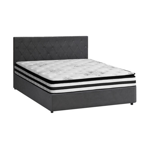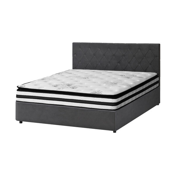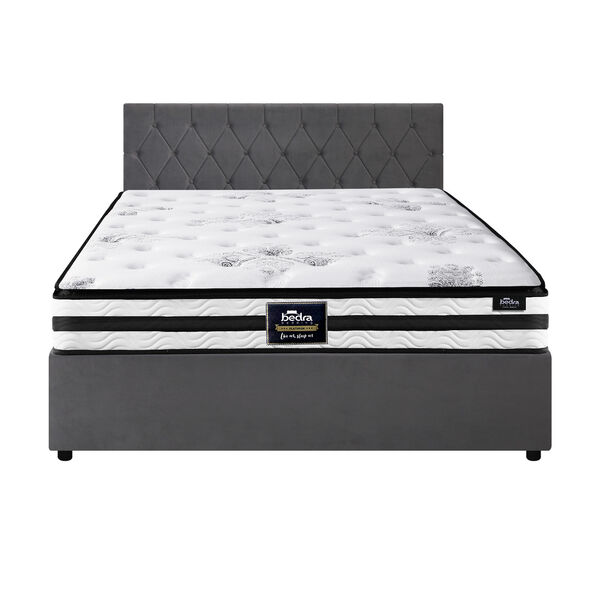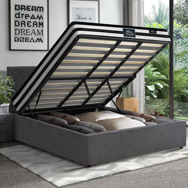 Featuring a tall and well-padded 3D tufted diamond-matrix bedhead and upholstered with premium velvet (grey model) all around the bed frame, the Gas Lift Bed Frame exudes bespoke elegance and adds a luxurious presence to any bedroom decor. Soft to the touch that lends a swank and intimate aura to accompany your calm and restful sleep. But there is more to the bed frame than just an attractive appearance. The finishing is meticulous with exacting workmanship all round. Inside, the 13mm thick plywood slats provide end-to-end support for the mattress while the sturdy legs ensure that the bed frame stands up to durable use time and again. Plus, the bed frame is definitely more than meets the eye. With its assisted hydraulic gas lift hinges, the bed can be easily brought up to reveal generous storage space for bedding and other assorted bedroom essentials. Best of all, the stylish bed frame also includes a comfortable Bedra Bedding Bonnell springs mattress to complete the set. This high-quality silver-ions knitted fabric mattress features all the benefits of a Bonnell springs system that provides reinforced edging, motion isolation, anti-disturbance and full body support. Naturally, the highly breathable mattress complies with all required standards and certification and is hygienically safe from top to bottom and everything else in between. The Gas Lift Bed Frame. Made it yours to enjoy. Available in king single, double, queen and king sizes.