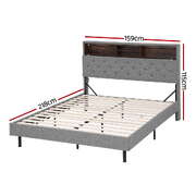 Elevate your bedroom with the Queen Storage Bed Frame. Features smart RGB LED lights offering flexible ambiance settings. The practical headboard provides multi-layer shelving, while discreet under-bed space offers ample storage. Relax against the comfortable padded and tufted headboard. Built with a durable timber and steel frame and supportive LVL slats, this reliable platform bed frame supports queen mattresses. The modern grey linen finish complements contemporary decor. Assembly is straightforward.