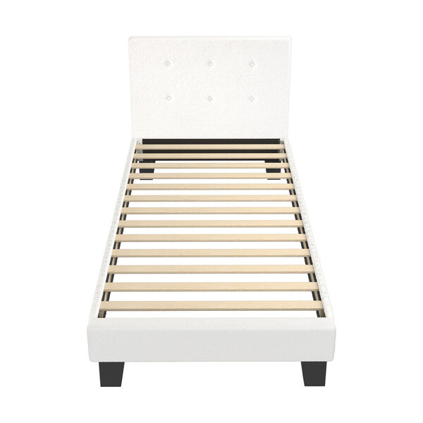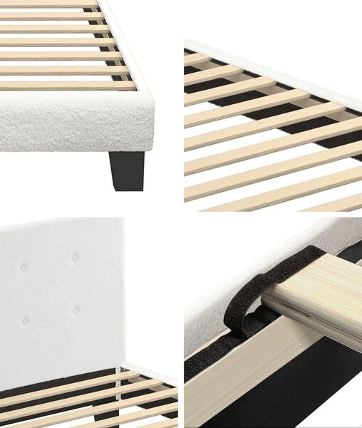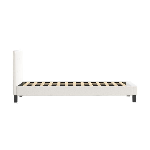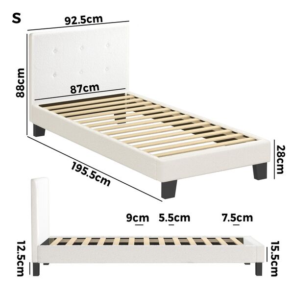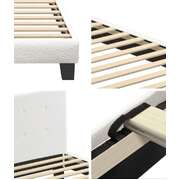 Featuring an expansive and quilted bedhead design, the Polo Bed Frame oozes a blend of classic elegance and contemporary flair to add to any bedroom decor. And its form also merits its function. Lean back to read, watch TV or interact with your favourite media devices, the supportive bedhead ensures many hours of pleasure without encountering any stress or strain. All around, the chic white Boucle fabric upholstery that covers the bed frame from head to end is soft to the touch and creates a swank and intimate aura to accompany your calm and restful sleep. And true to its character, the bed frame finishing is meticulous with exacting workmanship all round. Inside, the thick 13mm plywood reinforced slats provide end-to-end support for the mattress while the sturdy legs ensure that the bed frame stands up to durable use time and again. Better still, setting up the bed frame is hassle-free with Velcro-enabled slats that simply fasten to the bed frame for better grip and stability. In fact, the entire bed frame assembly can be completed in less than 30 minutes. The Polo Bed Frame is compatible for use with most Australian-sized mattresses and is available in King Single, Double, Queen and King sizes.