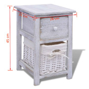 Add a touch of rustic charm to your home with these chic wooden bedside cabinets! They can also be used as telephone stands, side cabinets, small cabinets, drawer cabinets, storage cabinets, nightstands, night cabinets, bedroom cabinets, end tables, end cabinets, etc. These compact cabinets each have a smoothly running drawer, which provides ample space for keeping smaller items organised and within reach. Beneath the drawer, you will find a removable wicker basket for extra storage space. The fabric liner of the baskets can be removed and washed. Delivery includes 2 bedside cabinets.