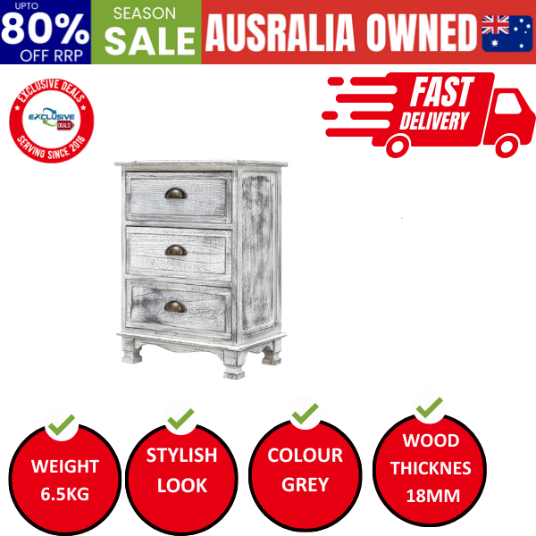 Bedside Table 3 Drawer Vintage Side Table Storage Cabinet Bedroom CLARA - Grey
