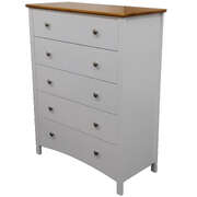 Storage cabinets play a huge role when it comes to keeping your living room tidy.So, keep a 5-drawer tallboy and a 2-drawer bedside table set in your bedroom, and keep the room well-organized. The bedside-tallboy set looks lovely in a white painted finish with light pine tops. The Hampton design furniture pieces will turn your bedroom into a spotless haven. The beautiful tallboy has 5 sizable drawers, and the bedside tables have 2 drawers each. All the drawers have full-extension metal runners and round silver metal handles. The tallboy and bedsides are made of Rubber wood, and MDF harvested in a sustainable way. The wood is known for its strength, resilience, and rot resistance. The MDF wood is resilient to moisture damage, and the rubber wood keeps the furniture weather-proof. The sleek and fully assembled furniture pieces look good with a variety of interior decor styles and come with a one-year warranty.