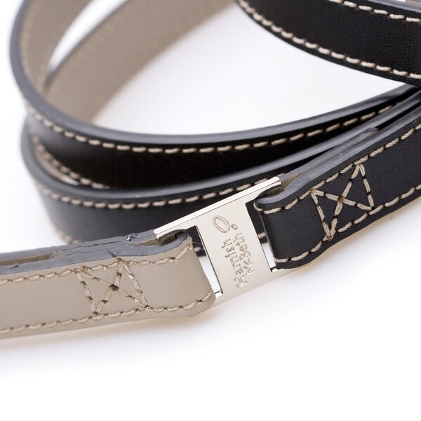 Black slim leather dog lead with a beige handle and matching stitching to suit any black collar or dog harness.
