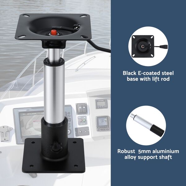 Transform your time on the water with our Gas Lift Boat Seat Pedestal - the ultimate upgrade for unbeatable comfort and stability. Effortlessly customize your seating height with the ultra-smooth gas lift, whether you're fishing, cruising, or just relaxing. The oversized 17 x 17 cm top plate guarantees rock-solid stability, while the 360 degrees swivel lets you move freely and safely around your boat. Built tough to resist corrosion, the heavy-duty steel base and premium aluminium post stand up to the harshest marine conditions. Installation is a breeze - fits most seats with standard 4-hole mounts. Supporting up to 181 kg, this pedestal delivers strength you can trust. Don't settle for less - elevate your boating experience with this must-have seat pedestal today!