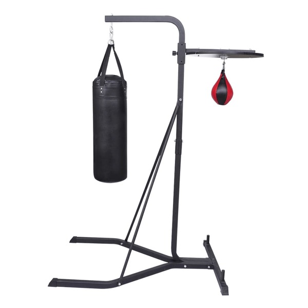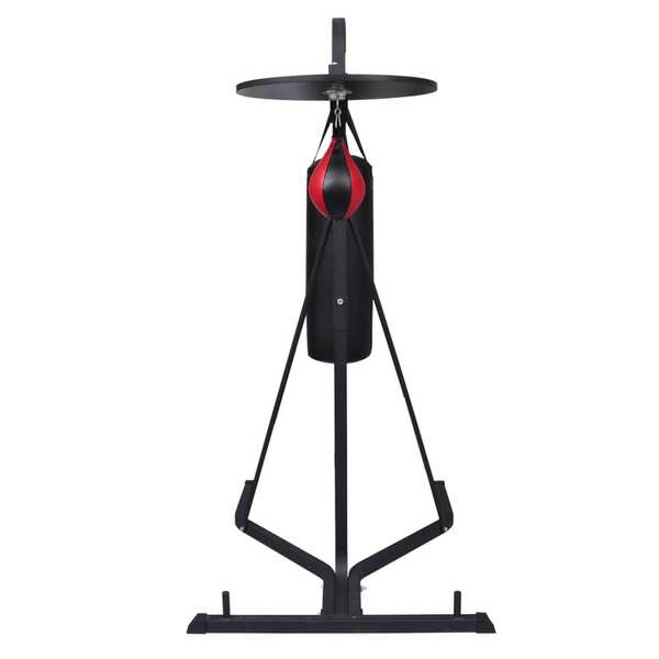 This 2 way boxing stand comes with a punching bag holder and a speedball plate, suitable for endurance training purposes. Robust and stable frame: The metal and wood frames ensure durability and stability.Durable material: The platform is made from engineered wood. Engineered wood is a versatile material that is popular for its smooth surface, stability, and durability. It is resistant to warping and splitting, making it an excellent choice for a wide range of applications such as furniture, construction, and home renovation projects.Faster rebound: The speed bag is attached to a swivel pin that ensures smooth 360° potation and rebound faster. Perfect for speed punching practice at home or in the gym.