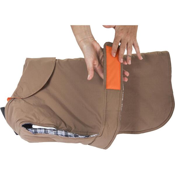 The earth brown all-weather dog coat with orange highlights is an outdoor gear essential. The unique design of our dog coat allows it to wrap around the chest area to cover and provide extra protection from rain and mud. Easy to fit with velcro straps on top.