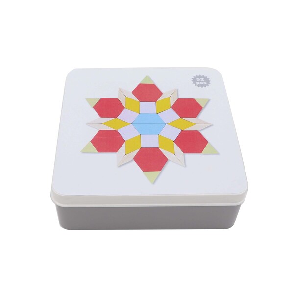 52 pc set of wooden tiles in geometric shapes and assorted colors. Arrange them to make beautiful pictures and patterns. Finished in non-toxic paint