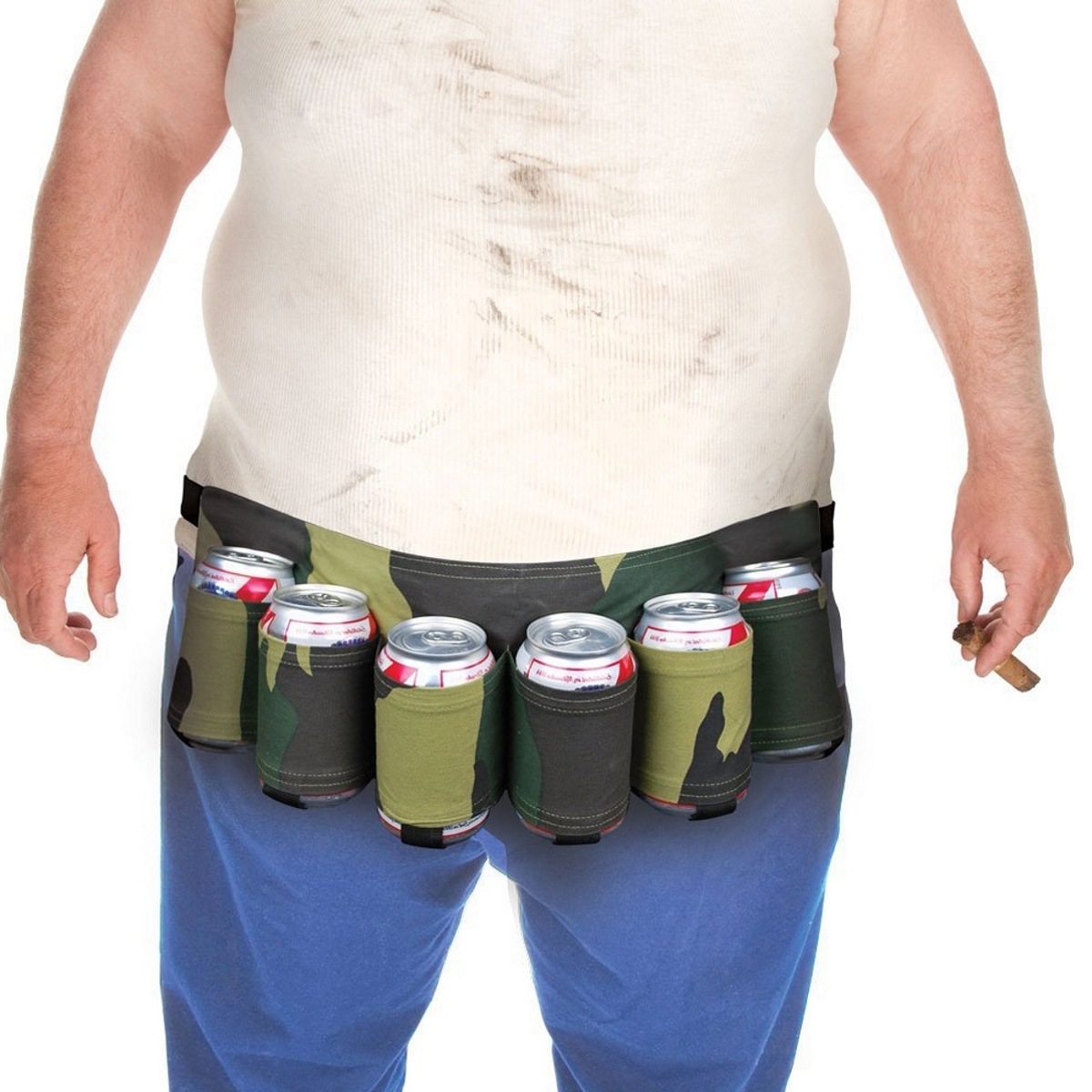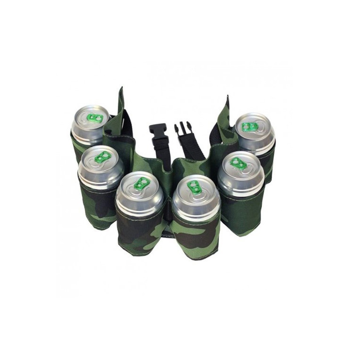 Holds 6 can or bottle beer/soda Comes in camo color Adjustable waist up to 52-inch Quick snap buckle Perfect for the life of the party!""