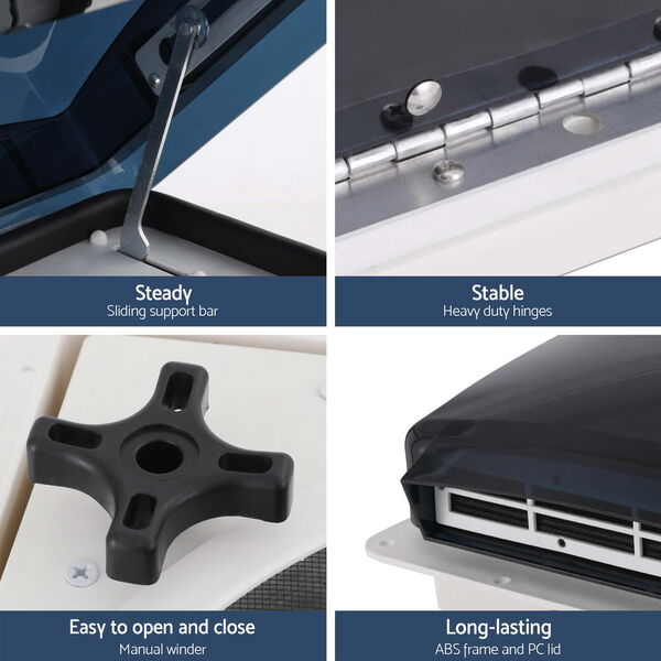 Need a breath of fresh air while travelling? The Caravan Vent is designed to enhance fresh air circulation in your caravan with ease. With its 50 degree wide-angle opening, it allows for maximum airflow, ensuring a comfortable and refreshing environment inside. Whether it's summer or winter, this vent is suitable for use in all seasons and weather conditions. One of the key features of our caravan vent is its low-noise operation, ensuring a peaceful and quiet atmosphere inside your caravan. Additionally, it effectively prevents insects from entering thanks to the stainless-steel flyscreen, providing you with a bug-free space to relax and enjoy your time. The single-speed reversible fan helps to keep moisture and odours out of your caravan. Furthermore, this vent is compatible with various roof thicknesses, making it versatile and easy to install. Upgrade your caravan with our caravan vent and experience improved air circulation and comfort like never before with the Caravan Vent.