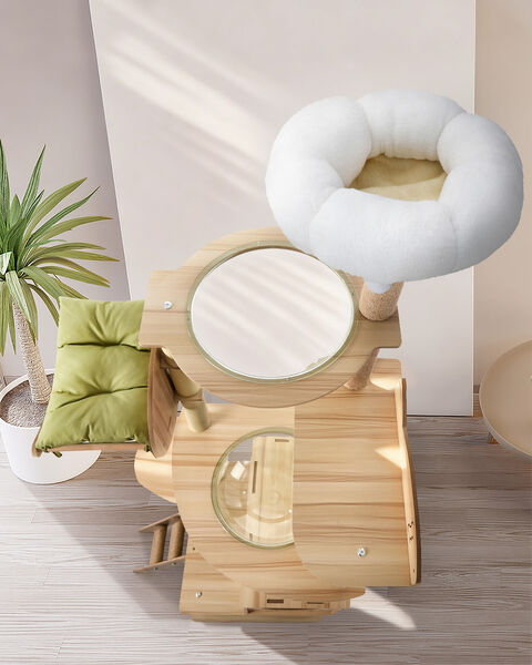 Made of sturdy E1 particle board, the cat tree is designed for robust use and yet comfortable enough with plush cushions to get your cat purring with delight at every post, nook and corner, and detachable transparent bowls to observe kitty as it cuddles in play. Better still, set-up is quick and fuss-free so that your cat can get on to all that it naturally loves to do with our cat tree in no time at all.