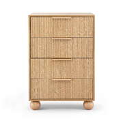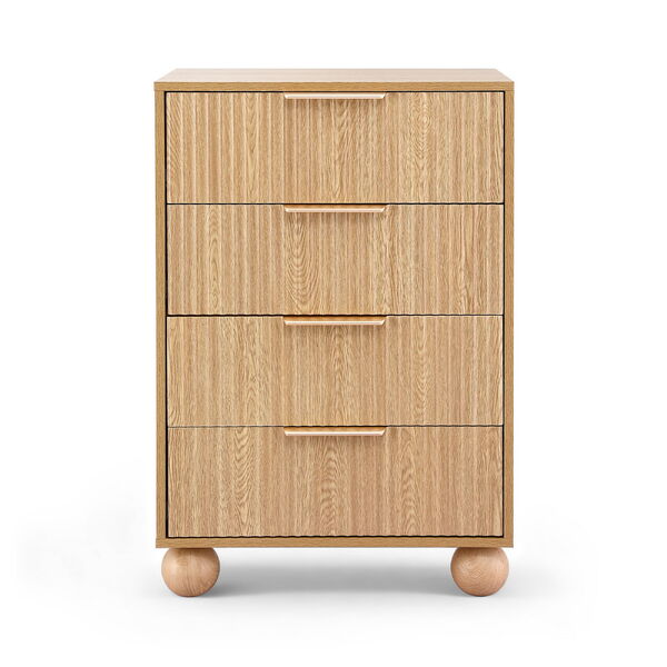 Elevate your Aussie home with the storage cabinet, a versatile solution featuring four smooth-sliding drawers fitted with sleek metal handles and framed by a elegant fluted-style front. Crafted from E1 grade 12/15mm particle board with a durable scratch and wear-resistant melamine finish, it stands sturdily on stylish ball-shaped legs suited for both timber and tiled floors.