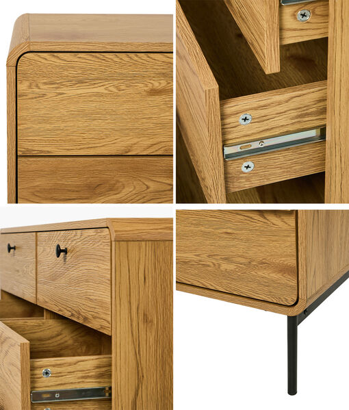Constructed with 15mm particle board, the chest of drawers maintains a good sense of structure and durability. Plus, the sturdy metal legs frames are strong to the task and make for easy cleaning underneath the chest of drawers. The attention to detail is meticulous, evidenced by the fine workmanship from top to bottom.