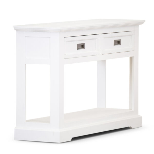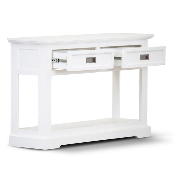 This sleek and beautifully designed 2-drawer console table is composed of sustainably sourced Solid Acacia and MDF. The wood ensures the strength and durability of the table for years to come. It also takes care of your storage needs. The console table, with a wide open shelf on its lower part, is angled just at the right places to maximize its clean line aesthetics.Designed in the coastal style, the stunning console table features a minimalist, functional, and contemporary design. Due to the vivid white colour, it exudes a serene feel in the atmosphere, which helps in creating a nice ambience in the living area. The console table comes with a one-year warranty.