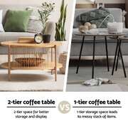 The Set of 2 Coffee Table combines sleek modern design with functional storage solutions. Crafted with sturdy 15mm E1-grade MDF surfaces and a robust metal frame, this two-tier coffee table offers reliable durability for daily use. Its unique straw rope-inspired metal accents add rustic charm to contemporary spaces, while the non-slip floor protectors safeguard your flooring. The easy-clean surfaces resist stains, perfect for busy households. It effortlessly fits into living rooms, lounges, bedrooms, or studio apartments. Organise magazines, remotes, or décor on the dual shelves – a practical yet stylish centrepiece for modern living.