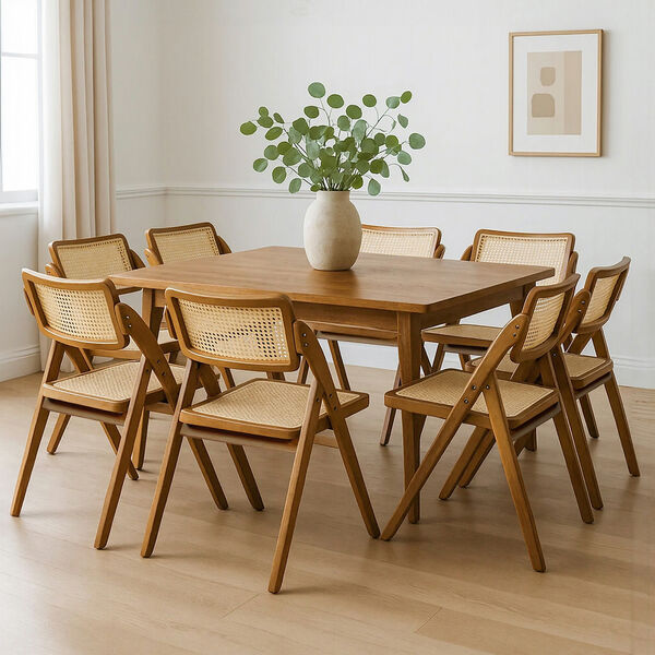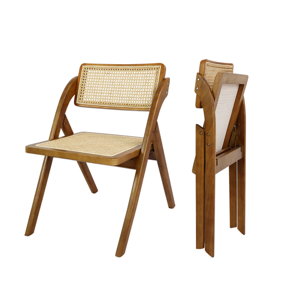 Bring warmth and sophistication to your home with the Rattan Dining Chairs in Walnut. Designed to blend functionality with classic aesthetics, these chairs feature a solid rubber wood frame with intricate rattan accents, adding a natural touch to any dining or lounge space. The foldable design makes them perfect for compact living, providing effortless storage and versatility.