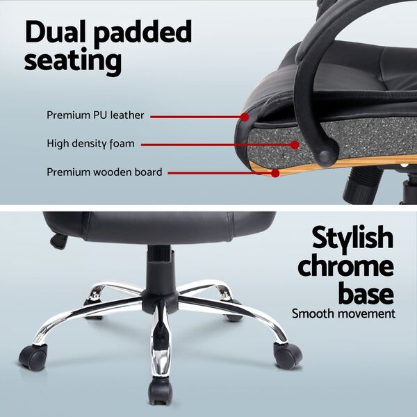 Paired with the desk is an office chair upholstered in PU synthetic leather for a sleek, professional look. Designed for all-day comfort, it features a high back, multi-layer padded seat, and cushioned headrest and armrests. The tilt adjustment and gas lift allow for customisable positioning, while the 360° swivel and durable chrome base with five castor wheels ensure smooth movement. Functional and stylish, this combo is perfect for any workspace.