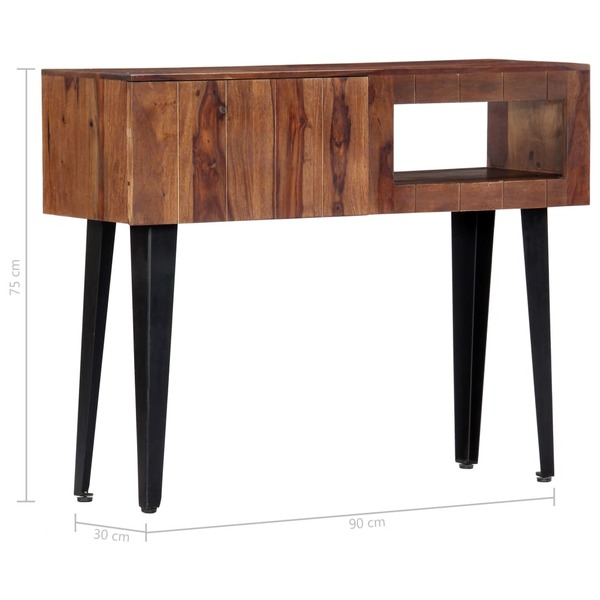 Equal parts sophisticated and elegant, this wooden console table gives a nod to a vintage charm and industrial style with its solid sheesham wood and powder-coated iron legs. Equipped with 1 drawer and 1 shelf for various items, this hall table will definitely be a practical and eye-catching addition in your home. This console table is multipurpose, meaning that it can also be used as a dressing table to place under the make-up mirror. Made of solid sheesham wood that has been applied to a beautiful finish by polishing, painting and lacquering, the hall table exudes a refined look. Sheesham, also known as rosewood or Palisander, is a tropical hardwood that is famous for its rich grains. Additionally, the powder-coated iron legs add to the vanity cabinet's stability and industrial style. Important note: Variations in colour and wood grain makes each of our furniture unique and slightly different from the next. The delivery is random, ensuring the exclusivity and individuality of your product.