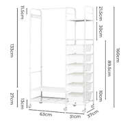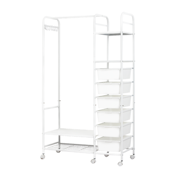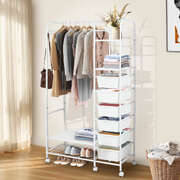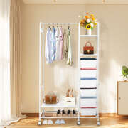 Say goodbye to clutter and hello to organized style with our all-in-one clothes rack! This sleek and sturdy wardrobe rack is designed to make your life easier—featuring a horizontal bar to hang your clothes, 4 handy storage boxes, and 6-8 side hooks for accessories. Need extra room for shoes? We’ve got you covered with a bottom shoe storage area! Not only does it have a strong load-bearing capacity, but it also moves smoothly on silent wheels with brakes, so you can easily roll it around and keep it in place. With rounded edges for safety and a design that’s both aesthetic and practical, this is the perfect addition to any room. Enjoy large capacity, easy access, and a stylish touch—all in one!