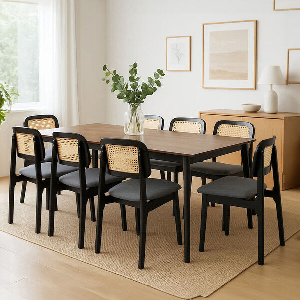 Contemporary Dining Chair Wood Rattan Armless Black x8 - Space-Saving
