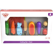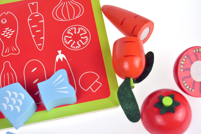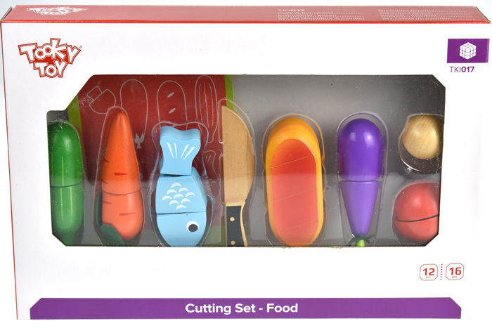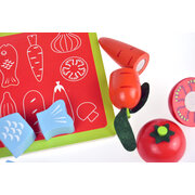 Wooden food and cutting board set. This set include vegetables like egg plant, carrot, fish , bread and more. Everything there for a healthy dinner. Made with good quality wood. Paint used are non toxic. Cutting the food up will help with fine motor skills.