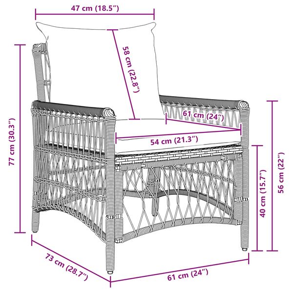 This Modern Garden Chair is all about being stylish and practical, making it a must-have for any outdoor area. With a mix of simple and classy design, its clean lines fit in everywhere. It’s built tough to handle the weather, inviting you to kick back and enjoy your time, whether you’re relaxing or having fun with mates. Poly rattan finish The chair sports a poly rattan exterior, chosen for its UV-resistant qualities, so it’ll look fab for ages. The trendy weaving suits any outdoor decor, ensuring it stays appealing regardless of the weather. Protective steel frame Designed for durability, the chair has a powder-coated steel frame which is tough as nails. This coating keeps it safe from the elements, helping it maintain shape over time in different climates, giving you solid support. Comfortable seating Equipped with an outdoor-friendly cushion, made from weather-resistant fabric, you can lounge comfortably regardless of the weather. The foam filling makes it a comfy spot for both lazy days and social gatherings. Ergonomic design With user comfort in mind, the chair has a smart backrest and armrests. The poly rattan back eases sitting discomfort, while the arms give extra support, making every sit a good one. Low maintenance Keep it looking fresh with minimal effort. A simple wipe down with a dry cloth removes any dust or dirt from being outside. This easy care means it’ll stay inviting throughout its use.