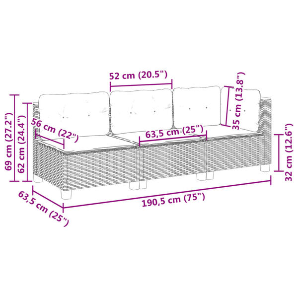 - Sofa overall dimensions: 190.5 x 63.5 x 62 cm (W x D x H)