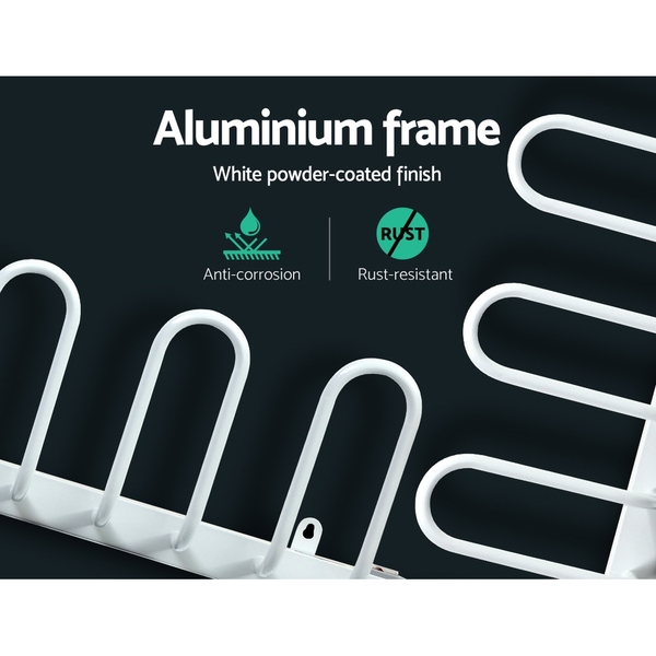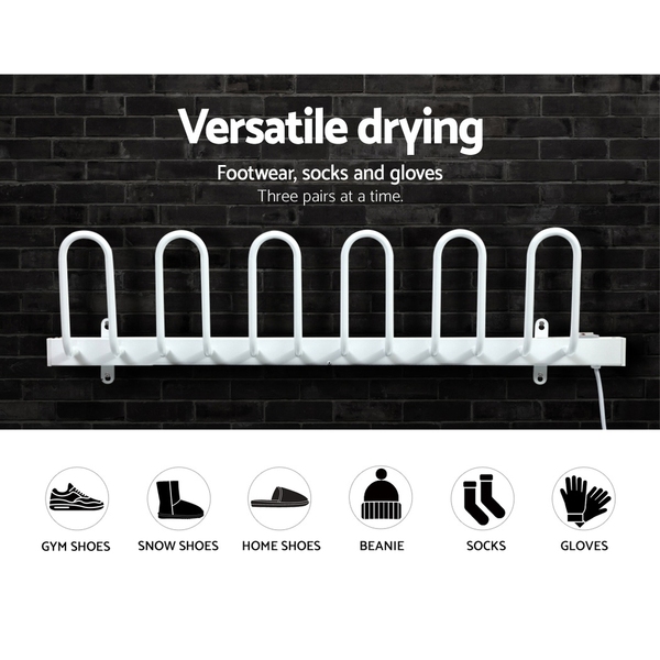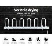 Say goodbye to damp footwear and all the problems of mildew, bacteria and athlete’s foot that are associated with it. With our Devanti Electric Shoe Warmer Rack, you can have dry and comfortable footwear at the times, even in bad weather. Made of aluminium with a white-powder coated finish, the rack is 100% waterproof and rust-resistant. Its heating coil system is totally energy-efficient and can save up to 30% in energy costs for very economical warming. The coil heats up fast between a temperature range of between 45°C and 55°Cthat will also help to eliminate all bacteria, germs and mould without damaging the footwear. The rack is also space-saving with its wall-mounted feature and works silently with lasting durability. Best of all, the six heated racks can use to dry other items such as socks and gloves for ultimate versatility.