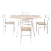 The set includes a large table and four stable chairs, all presented in a fresh Natural wood-look surface paired with a clean White powder-coated metal frame for a modern, breezy Scandi aesthetic. Comfort is key, with the chairs featuring arched seats and an ergonomic backrest for great support. The entire unit is built tough, using a sturdy powder-coated metal tube frame, durable steel fixings, and reinforced installation hardware.