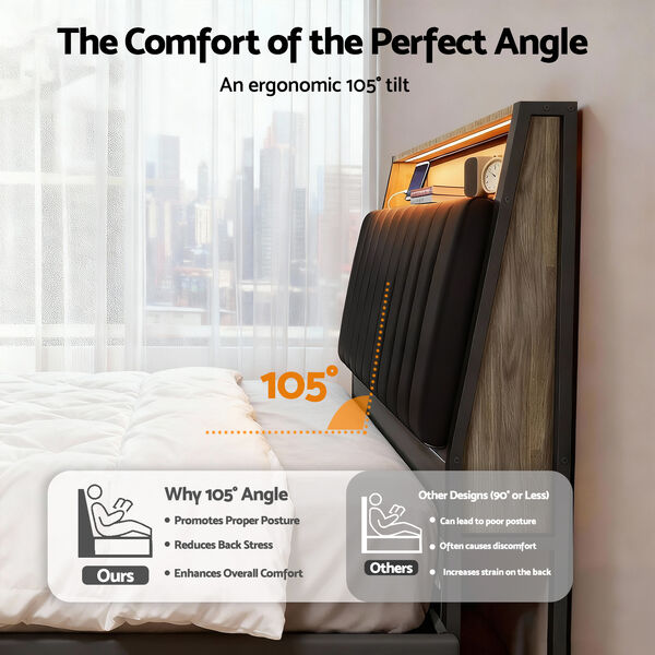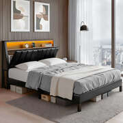 The Double Bed Frame features dynamic LED lighting with 16 colours adjustment. Its upholstered storage headboard offers hidden organisation space, while integrated Tri-plug, USB, and Type-C ports keep devices charged. Built with a reinforced timber-steel frame and 10 metal slats, it supports 300kg and fits all double mattresses (137cm x 190cm). Includes under-bed storage and quick assembly.