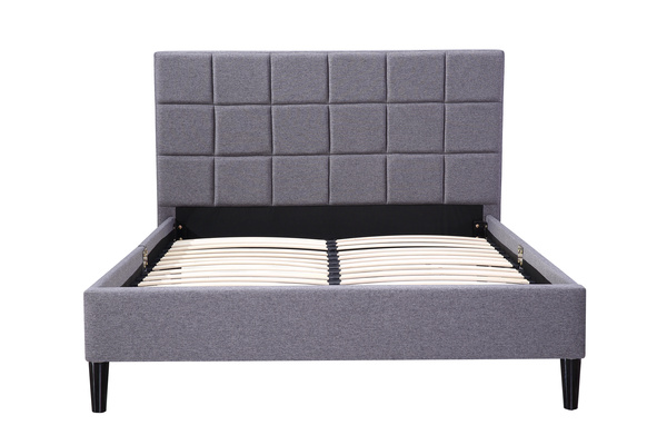 An exceptionally sturdy metal frame and support wooden slats provide a rock-solid foundation for your mattress that will surely lead to many restful nights. The Linen Fabric covering is similarly durable, not to mention easy to clean. The frame is designed to accommodate standard Double-sized mattresses with dimensions of 137 x 187 cm (mattress and linens not included). The headboard is 108.5 cm tall (15cm leg & 93.5cm headboard) from top to bottom, and the overall dimensions of the bed frame are 154 cm x 197 cm.