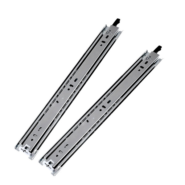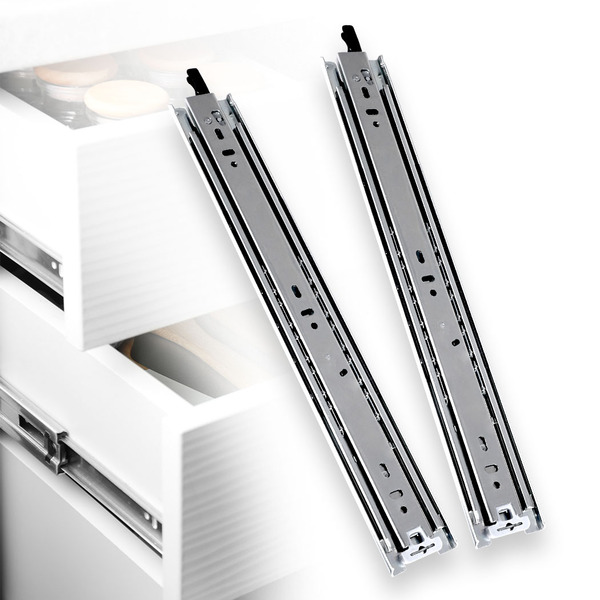 Designed with extreme precision and marvelous engineering. To hold your stuff strong, it is made of heavy-duty industrial cold-rolled steel. For added durability, our product is specially coated with reinforced zinc. It can hold a weight capacity of up to 75 kgs. Its steel construction provides active resistance towards rust and corrosion, no worry if liquids are accidentally spilled. It comes with heavy-duty solid carbonized ball bearings to support every slide you make. Intelligently structured with outer member, intermediate member, and inner member. The sliding mechanism has been tested 50,000 cycles to ensure its smoothness and durability. Expanse greatly with its 3-fold telescopic full-length extension. For safer functions featuring an advanced lock-in/lock-out trigger, press it to lock and press it to release. Very easy to install with simple instructions, side-mounted drawer slide.