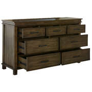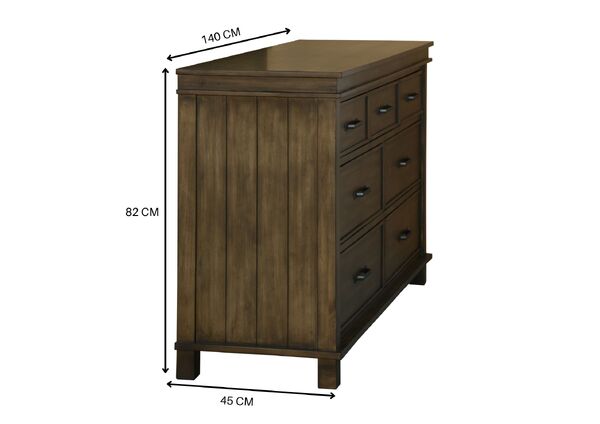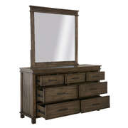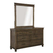 You may invite positive vibes into your bedroom by placing this good-looking dresser-mirror set here. The set, which includes a beautifully designed mirror and a spacious 7-drawer dresser, exudes positivity. The set is made of sustainably harvested solid pine wood. The wood is known for its amazing strength, great durability, shock-resistance, and ease of maintenance.The mirror is made of annealed glass of the highest quality. This type of glass gives the mirror a long lifespan. You may hang the mirror on a wall or attach it to the dresser. The dresser features plenty of storage space with large 3 over 4 drawers where you can neatly store your bedroom stuff and keep the room well organized. The sturdy drawers have full-extension metal runners and smooth-on-touch metal handles with an antiqued finish. The set is designed in the traditional style to give a bedroom a fashionable look. The dresser-mirror set in a rustic grey finish goes well with practically any interior decor style. A one-year warranty is included with the fully assembled dresser and mirror.
