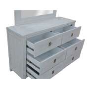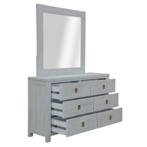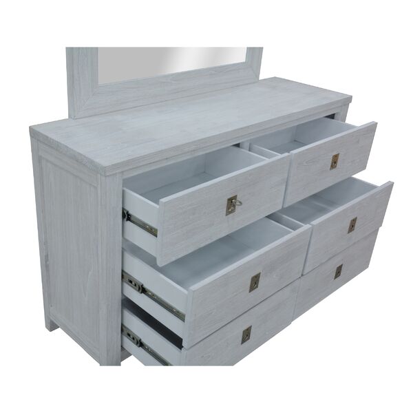 This amazing dresser-mirror set is crafted in a coastal style.The dresser has 6 drawers. The drawers have full metal extension runner and textured metal handle in silver colour. An equally beautiful, annealed glass mirror in a wooden frame makes the dresser even more useful. The furniture set is made of sustainably harvested solid Mindi wood. The wood is known for its amazing strength, durability, shock-resistance, and ease of maintenance. The set in a white-washed finish goes well with a variety of interior decor styles, and a one-year warranty is included with the easy-to-assemble set. Individual pieces are fully assembled.