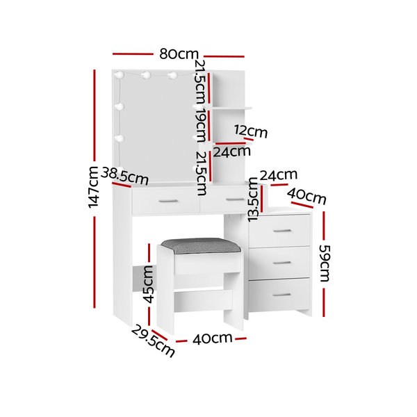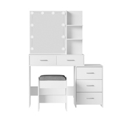 Feel like a star straight out of Hollywood with the Dale Dressing Table. Packed with generous storage and other convenient features, your new beauty routine will be a breeze. Made from quality particleboard with a white melamine finish, the table is built to last. The Hollywood-style makeup mirror is surrounded by bright LEDs for the perfect illumination. Choose from warm, neutral and daylight white light so you can always look stage-ready. The adjustable side chest features open shelves that you can use to display trinkets or beauty products. Five generous storage drawers give you instant access to your beauty essentials. A foam-padded PU leather stool allows you to sit in comfort while applying make-up or skincare and can be neatly tucked away when not in use. Easy to install and even easier to maintain, you'll love getting ready for the day in front of your new Dale Dressing Table.