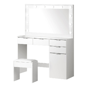 Plus, the durable E1 particle board-constructed dressing table is endowed with spacious tabletop, a USB input (cable included), four deep-set drawers and two adjustable closed shelves to keep all your makeup essentials and fashion accessories perfectly in place. Not least, the matching stool is aptly padded with high-resilient sponge and upholstered in PU leather for maximum comfort and cool sophistication with every sitting.