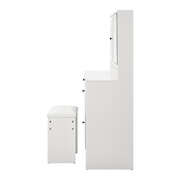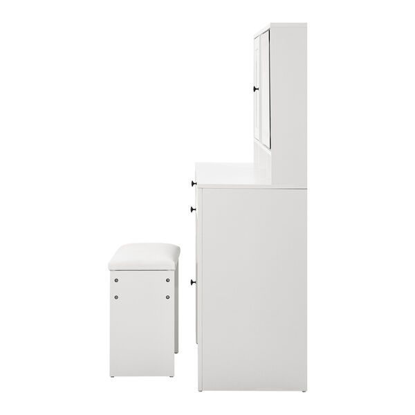 Store all your beauty essentials or more with a host of closed and opened options comprising open shelves, deep set drawers and two spacious cabinets that are always within your easy reach. Plus, stylish and constrasting black aluminium alloy handles adorn the immaculate white dressing table for more sublime chic and charm.