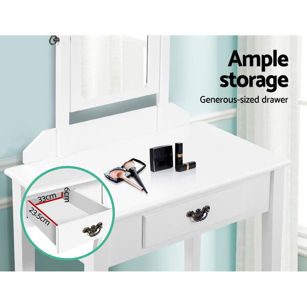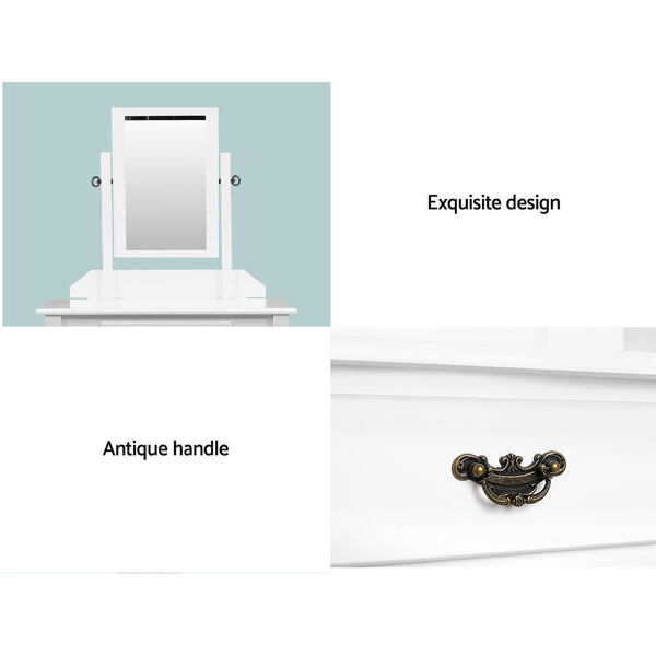 Add a touch of elegant charm to your bedroom with our luxurious period-style Artiss Dressing Table Set. Simple yet elegant, the set exudes finesse in every corner and aspect. Much like yourself as you prepare for the day in alluring beauty. Made with meticulous craftsmanship, the dressing table features a mirror that is 360° rotatable so that you can admire your reflection from any angle, and one drawer with an antique-style metal handle that provides ample storage space for your jewellery pieces and make-up essentials. And the piece de resistance must be the beautifully embroidered padded stool that is no less a work of passionate furniture making. Together, the ensemble is immediately captivating to the senses.
