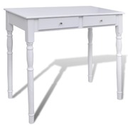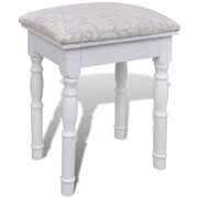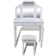This charming dressing table and stool set is made of high quality pine wood. Its Victorian style and clean white finish will bring elegance and beauty to your boudoir or changing room. The exquisite workmanship is another outstanding characteristic of this table and stool set. We have a 3 in 1 table mirror, 2 side mirrors of which are foldable with durable hinges. You are able to turn them to your desired angle. To one's surprise, the mirror frame and the table can be used separately. Two chic drawers offer you additional space for your ornaments, cosmetics and other private belongings. This dressing table and stool set will be an eye-catcher to wherever it goes. It will be quite easy to assemble with mounting accessories included in delivery.
