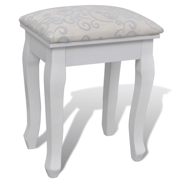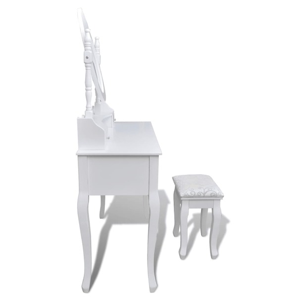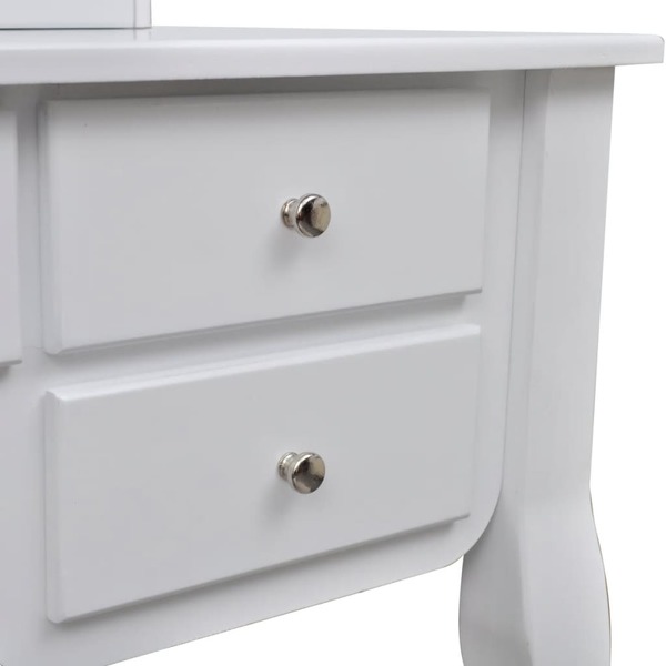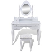 This charming XXL dressing table and stool set is made of high quality pine wood. Its Victorian style and clean white finish will bring elegance and beauty to your boudoir or changing room. The exquisite workmanship is another outstanding characteristic of this table and stool set. The table mirror has a free - standing frame, so you are able to pivot it to a desired angle. To one's surprise, the mirror frame and the table can be used separately. Seven chic drawers offer you additional space for your ornaments, cosmetics and other private belongings. This dressing table and stool set will be an eye-catcher to wherever it goes. It will be quite easy to assemble with mounting accessories included in delivery.