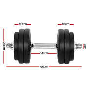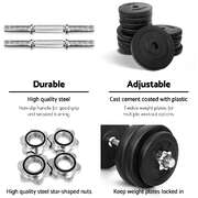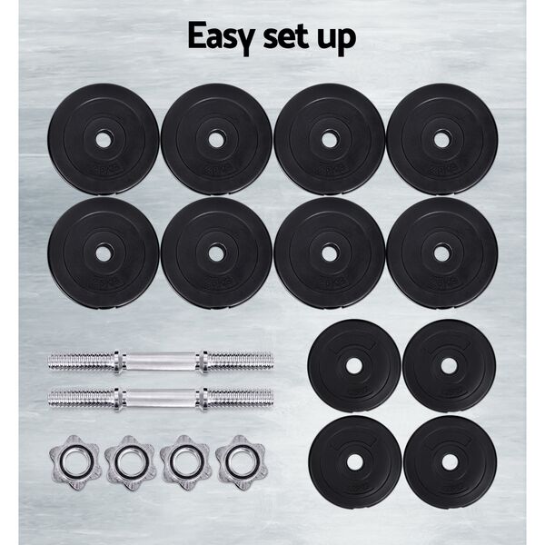 Time to get tough. If you are looking to boost those triceps, biceps and shoulders, our 30kg Dumbbell Set is the perfect deal for you. Whatever your game is, our dumbbell set lets you strengthen and tone those muscles your way. This commercial-grade set features a high-quality bar with non-slip handle that offers optimal gripping surface. Each weight plate weighs 2.5kg or 1.25kg and is made of cast cement coated with smooth plastic, reducing clanging sounds and making them more floor-friendly. You can adjust the weight of the dumbbell by removing the weight plate and only using the dumbbell bar (weighing 2.5kg each) or adding more compatible weight plates. The star-shaped nuts ensure the weight plates stay securely in place for safe workouts. Best of all, the dumbbell comes in a set of two (two 15kg dumbbells for 30kg total) so that you can exercise both arms at the same time. Gym junkie or workout pro, you can get fit easily with our 30kg Dumbbell Set.
