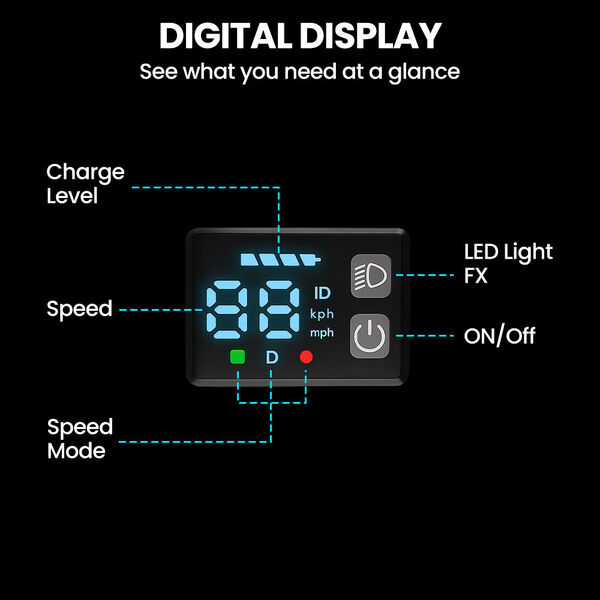 - DIGITAL DASH - See speed, mode, and battery level at a glance