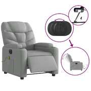Sit back and drift away in this highly comfortable electric massage recliner chair! Electric reclining function: This recliner chair is equipped with an electric motor that helps automatically adjust the footrest and backrest to any position as per your comfort with a simple press of the button on the side of the chair. This feature allows for a maximum tilt of 135 degrees. Additionally, the backrest can go automatically back to the original place with an easy press of the button.Vibration function: The featured 6 massage points let you experience a better-targeted massage. Additionally, the included hand control allows you to pick different massage programs. The massage function is powered by the USB connector that requires a certified 5V USB power source (not included).Comfortable seat experience: The thickly padded seat, backrest, and wide armrests covered in fabric provide a cosy and warm sensation, making you feel embraced while seated. The fabric features a simple and clean look and is breathable and durable.Convenient cup holders and side pocket: This armchair has two convenient cup holders for your drinks and a side pocket for your remote control or keeping your essential items within easy reach.Solid and stable frame: The frame made of wood and metal provides a strong structure and stability. This reclining armchair is comfortable and durable.