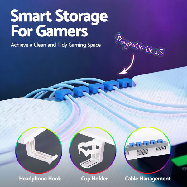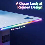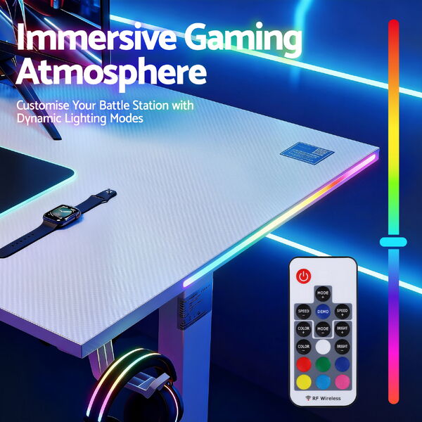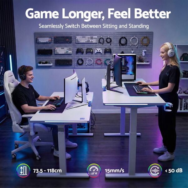 Designed for modern gamers, this gaming standing desk features electric height adjustment with memory control, RGB LED lighting, and a durable MDF desktop. Switch easily between sitting and standing while keeping cables organised for a clean gaming setup.